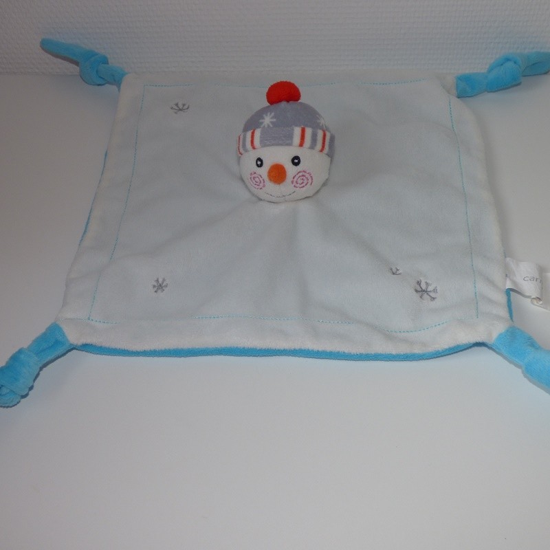 Doudou Bonhomme de Neige Plat Bleu et Blanc Carré Blanc