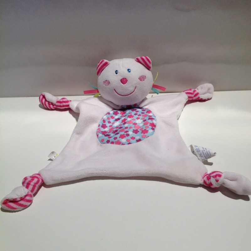 Doudou Chat Plat Rose et Blanc P tit Bisou
