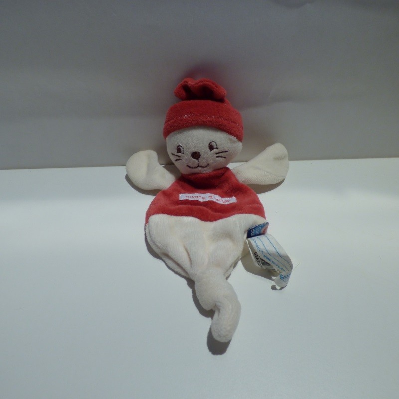 Doudou Chat Plat Rouge et Blanc Sucre d Orge