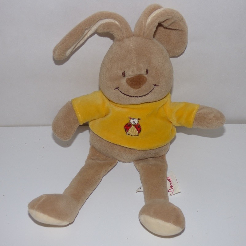 Doudou Lapin Beige et Jaune Broderie Coccinelle Bengy