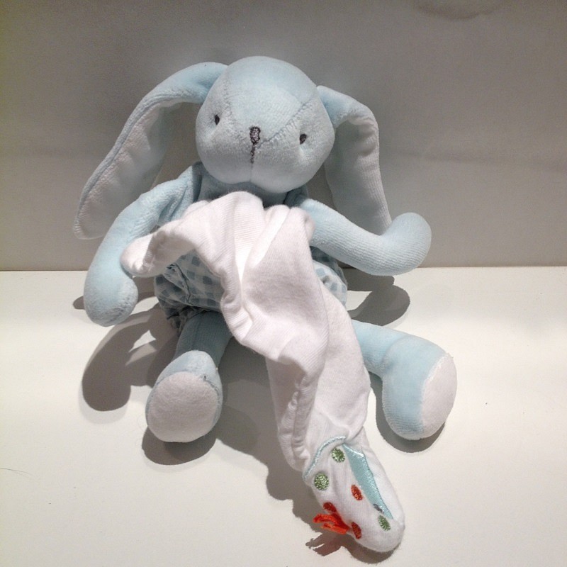 Doudou Lapin Bleu Mouchoir Blanc Berlingot