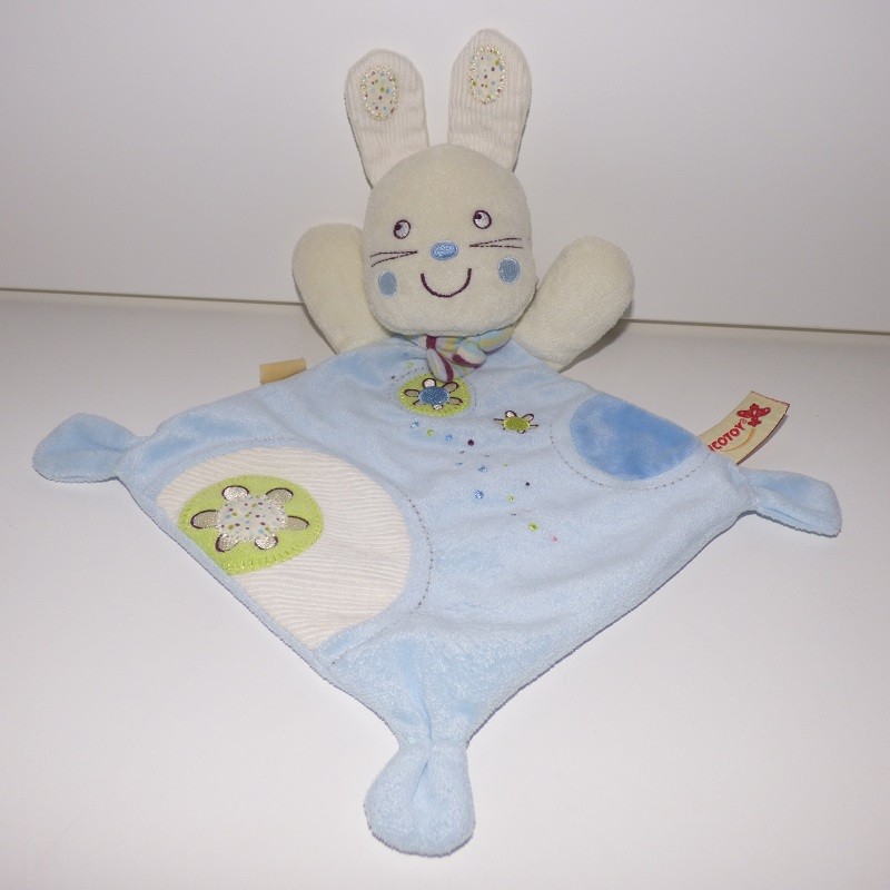 Doudou Lapin Plat Bleu Broderie Fleurs Nicotoy