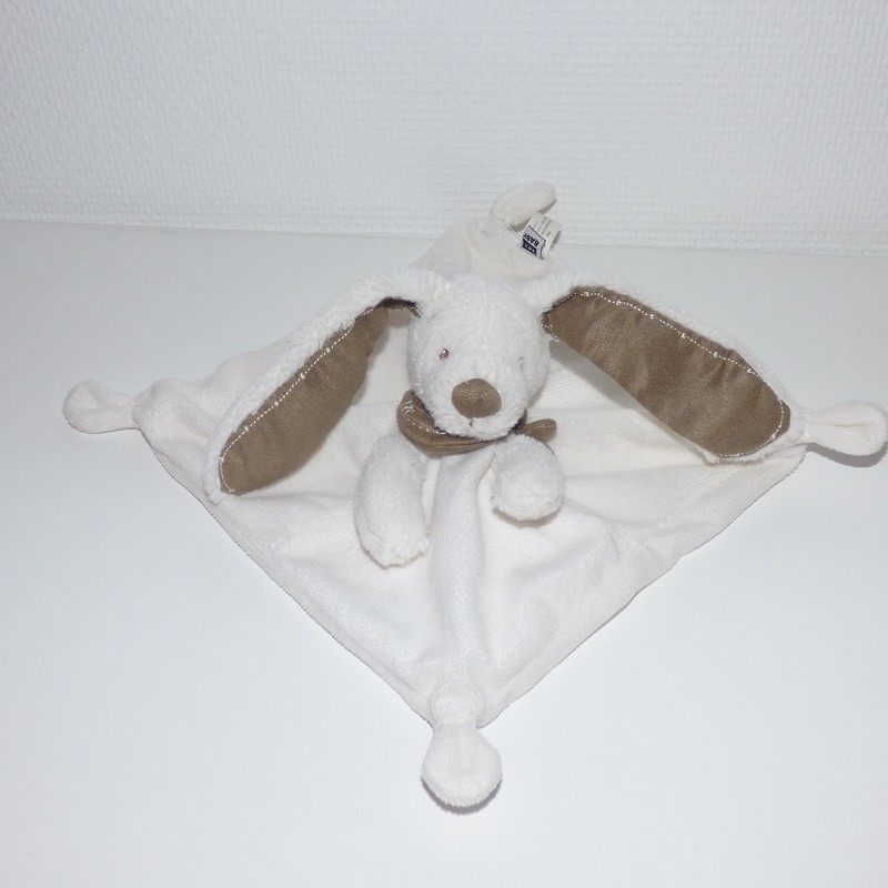 Doudou Lapin Plat Carré Blanc Bandana Marron Tex