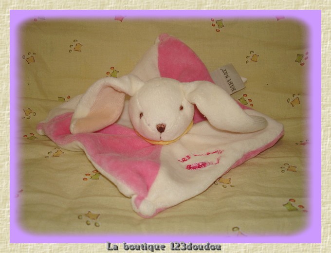 Doudou Lapin Plat Carré Rose et Blanc Babynat