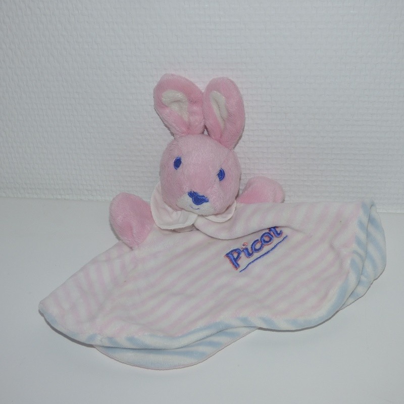 Doudou Lapin Plat Rayé Rose Blanc et Bleu Picot