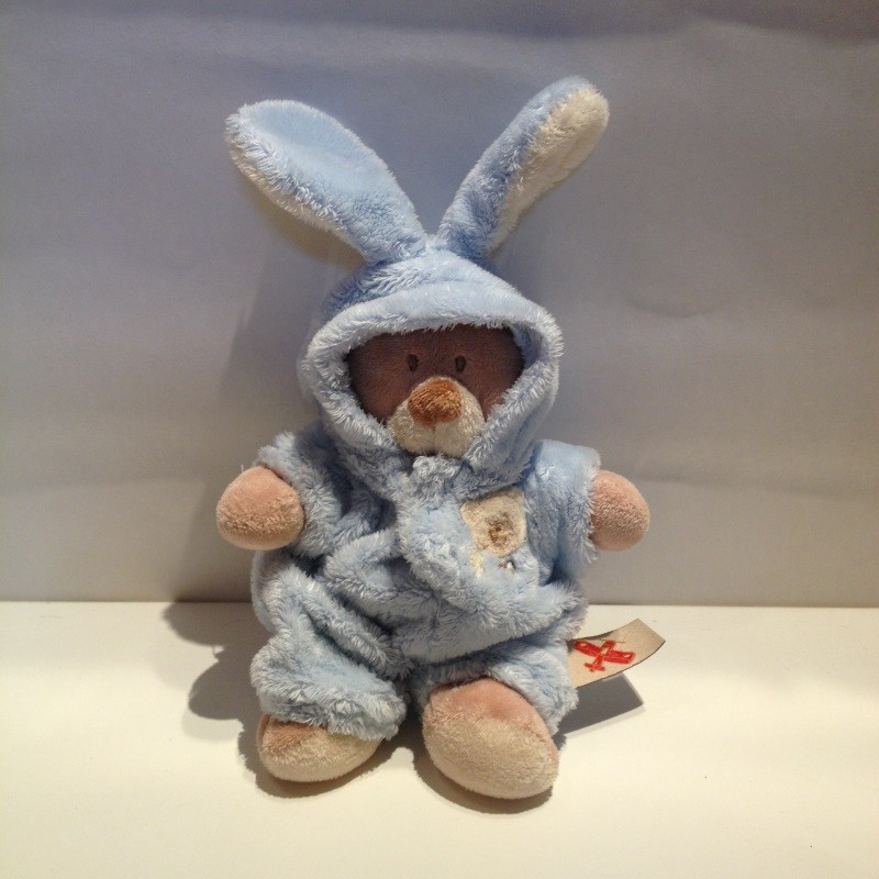 Doudou Ours Beige Combinaison Bleue Oreille de Lapin Nicotoy