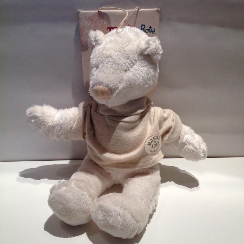 Habillé d un pull beige au nom du doudou