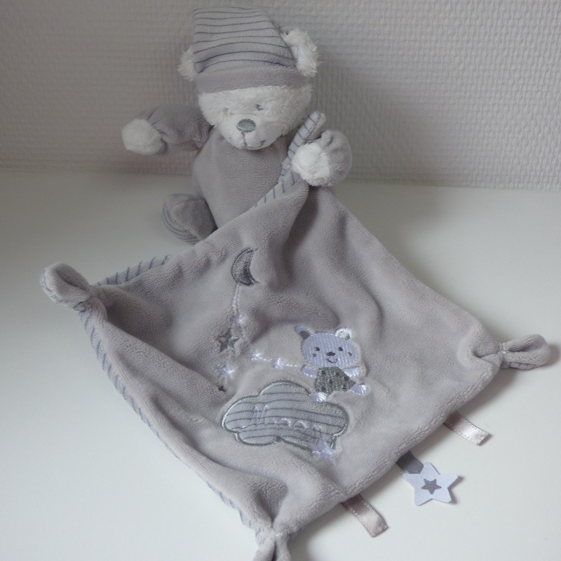 Doudou Ours Gris et Blanc Mouchoir Max & Sax