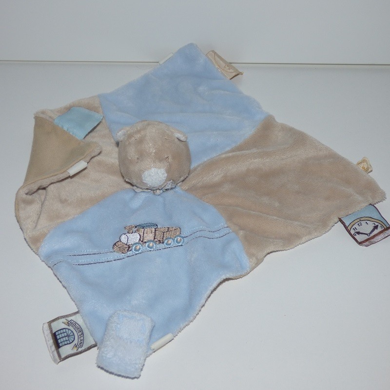 Doudou Ours Plat Beige et Bleu Train Noukie s