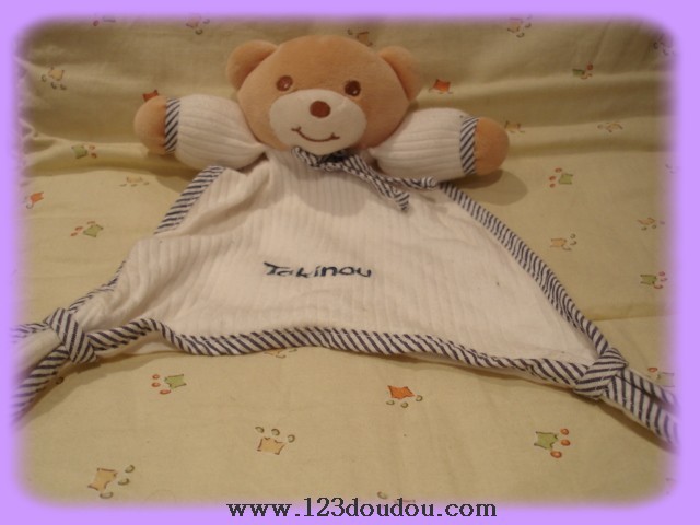 Doudou ours Plat Blanc Bord Bleu à Cotes Takinou