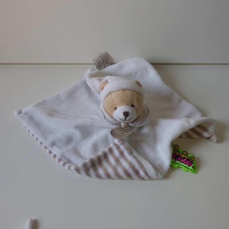 Doudou Ours Plat Blanc Tatoo Doublure Rayée Marron Doudou et Compagnie
