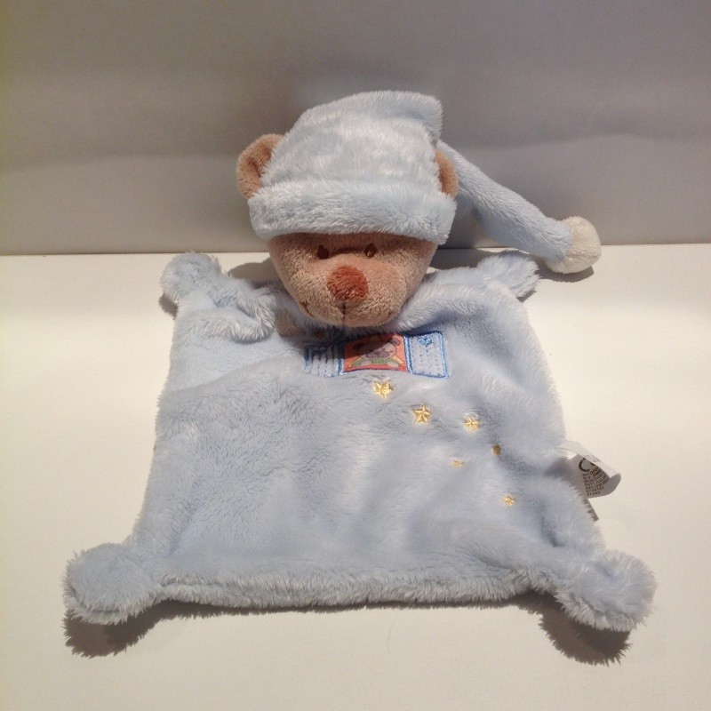 Doudou Ours Plat Carré Bleu Broderie Ours Nicotoy