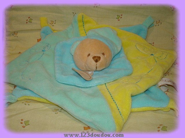 Doudou Ours Plat Carré Jaune et Turquoise Babynat
