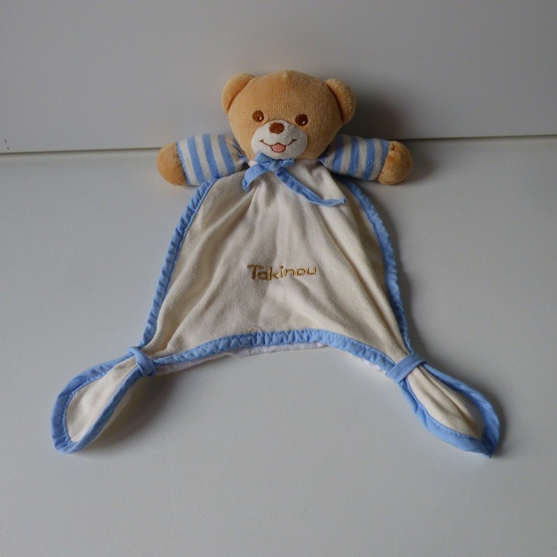 Doudou Ours Plat Rayé Ecru et Bleu Takinou