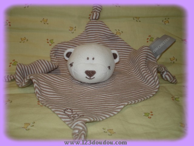 Doudou Ours Plat Rayé Marron et Blanc Orchestra