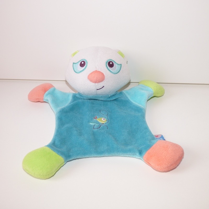 Doudou Ours Plat Turquoise Broderie oiseau Sucre d Orge