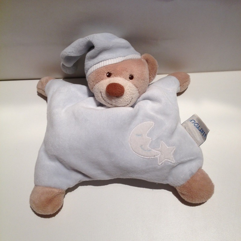 quantité de Doudou Ours Semi Plat Bleu et Beige Broderie Lune Etoile Nattou
