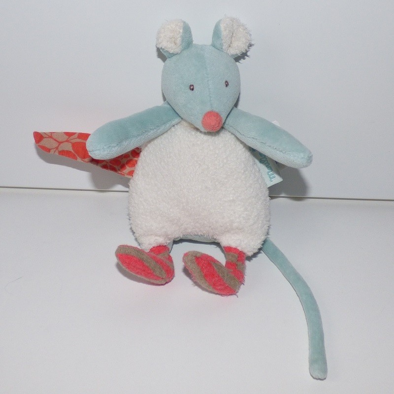 Doudou Souris Bleu et Blanc Biscotte et Pompon Moulin Roty Sos